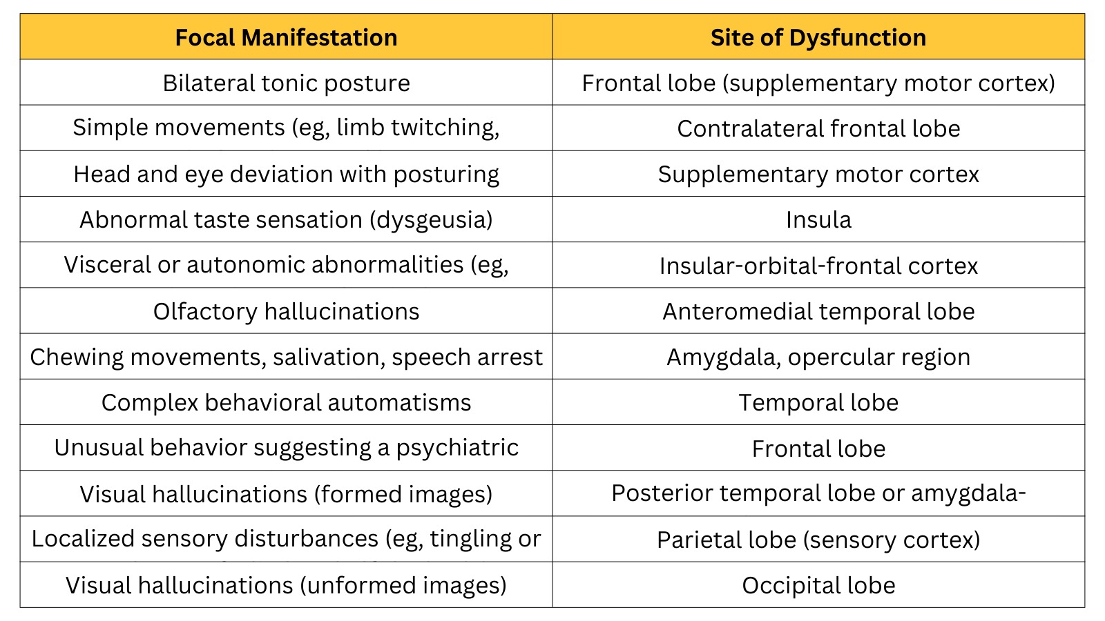 Specific symptoms of focal seizures help in localization, as they reflect the epileptogenic region of the brain. For example, simple movements like limb twitching originate in the primary motor cortex, abnormal taste sensation –dysgeusia, arises from the insula, and complex behavioral automatisms point towards the temporal lobe. More examples of the site of dysfunction according to seizure manifestation are in (Table 1).