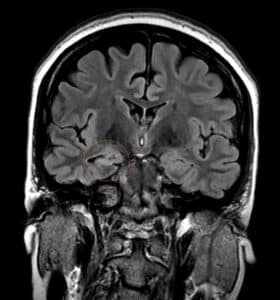 Temporal lobe epilepsy is the most common form of focal epilepsy. 70% of temporal lobe epilepsies arise from mesial temporal sclerosis/hippocampal sclerosis (Figure 4), which involves neuronal cell loss, gliosis, and sclerosis primarily in the dentate gyrus and CA1 section of the hippocampus, and loss of hippocampal volume and an increased T2 signal on MRI. Other causes of temporal lobe epilepsy include encephalitis (e.g., herpes simplex encephalitis), developmental disorders, neurodegenerative disorders, and tumors. Seizures occur in clusters lasting 30 seconds to 2 minutes on average. Typical symptoms include a visceral, olfactory, or auditory aura or feelings of familiarity or unfamiliarity, ictal motor symptoms –classically oral alimentary automatisms, or autonomic symptoms, and altered mental state without total loss of consciousness. With recurrent seizures, the limbic system can become impaired, resulting in impairment of libido, the menstrual cycle, and fertility, and memory. EEG shows temporal lobe spikes, and treatment includes pharmacotherapy, but due to the overall unfavorable prognosis of this syndrome, surgical options are offered for medication-resistant cases (22).