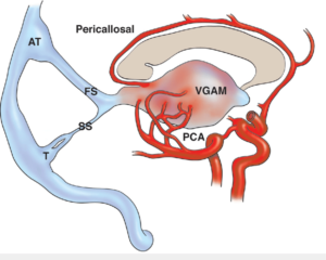 According to the relationship of the malformation to the VOG, the Yasargil classification categorizes VOGMs into 4 types as shown in Table 1. Types I to III are referred to as true VOGMs as they form a direct fistulous connection with the VOG without a nidus, while type IV is a true parenchymal AVM that drains into the vein of Galen via the internal cerebral vein, median atrial vein, or basilar veins [14].
