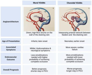 Depending on the angioarchitecture of the fistula, VOGMs can be divided into choroidal and mural types, as shown in Figure 6. The mural type consists of high-flow shunts that end up within the aneurysmal wall of the median prosencephalic vein and are supplied by the collicular and posterior choroidal arteries. The choroidal type requires the formation of a sizable arterial network between the venous aneurysm and the arterial feeder, which is fed by the choroidal, subfornical, pericallosal, and/or thalamoperforator arteries [1]. The mural form is generally associated with milder clinical symptoms and typically presents in infants and children compared to the choroidal form, which causes more severe symptoms and presents early in neonates [15].