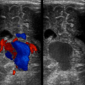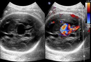Figure 2. Transcranial ultrasound of the brain. Left: Doppler examination demonstrating abnormal flow within the vein of Galen with aneurysmal dilation. Right: Grey-scale image at the same level showing the aneurysmal dilation of the VOG [8].