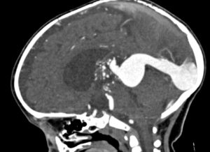 Vein of Galen malformation (VOGM) is a rare congenital anomaly of the cerebral vasculature. It is characterized by a direct connection between the arteries and veins of the brain, bypassing the capillary network. This connection forms a high-flow shunt that can overload the heart, leading to congestive heart failure (CHF), among other complications. Although this malformation constitutes less than 1% of all intracranial arteriovenous malformations, it represents 30% of all pediatric intracranial vascular malformations [1].